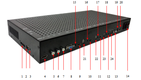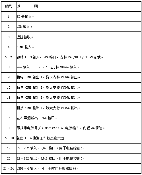 1、單臺(tái)支持4拼接HDMI接口輸出,支持20臺(tái)級(jí)聯(lián)使用;