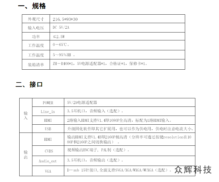 此款為ZH-R100的升級高端版本ZH-R400,此版本為全新發(fā)售,Linux嵌入式系統(tǒng),支持NPU,全按鍵操作,自動記憶,自帶測試底圖,沒有信號接入時也可以調(diào)試,輸出分辨率可以設(shè)置為1080P和2160P。支持上下左右鏡像,可做為題詞器使用。彌補(bǔ)之前版本分辨率低,顯示文字不清楚的問題,如果對顯示要求不高,價絡(luò)敏感的用戶也可以選擇ZH-R100 如果有更高要求,也可以選擇ZH-R500,4K輸入和4K輸出版本,如果喜歡安卓系統(tǒng)可以選擇ZH-R300。